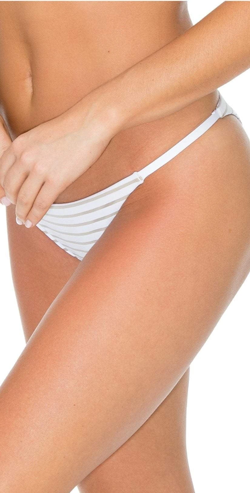 The Aerin Rose Anza Stripe Mercury Bottom is a low-rise white and opal striped bottom featuring thin side straps and cheeky coverage. This bottom pairs perfectly with the Aerin Rose Anza Stripe Tri Top.