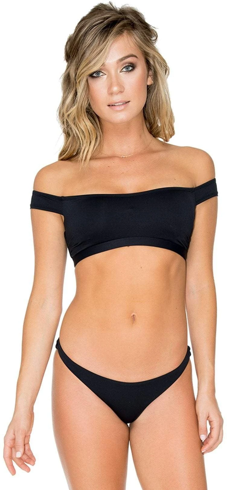 This Aerin Rose Obsidian Zaliya Top In Black is a sexy off the shoulder black top with a lace-up back. This chic and sophisticated top pairs perfect with the matching Obsidian Mercury Bottoms.