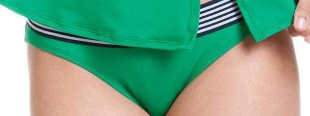 The Anne Cole Retro Hipster Bikini Bottom in Green features a solid kelly green pant with a stripe design on the waist band. These bottoms offer full back coverage.