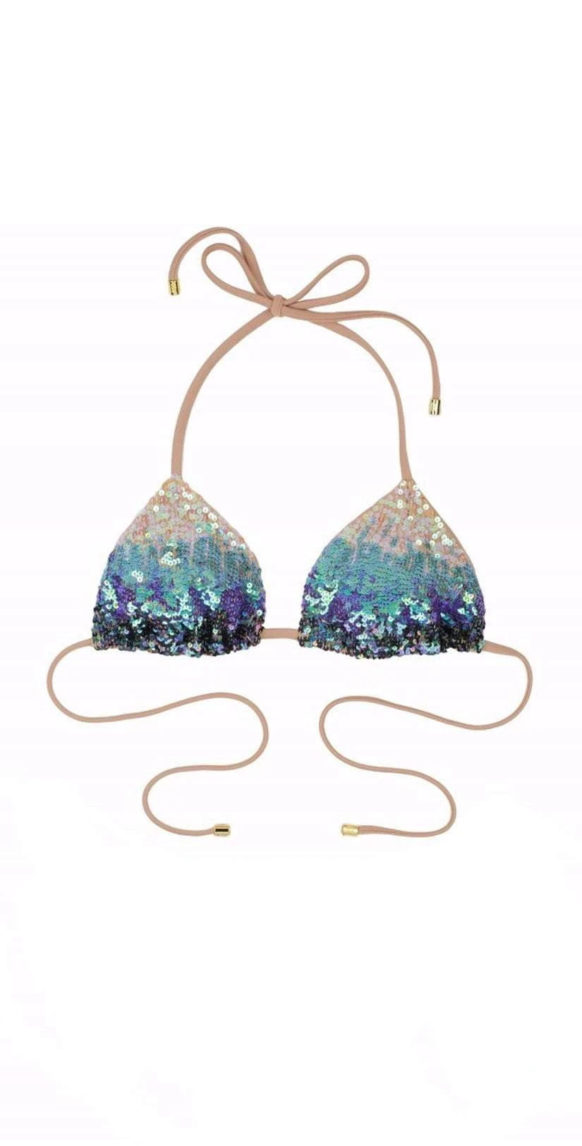 The Beach Bunny Ariel Tri Top has purple, pink, blues and nudes to give the sequins an illusion of being a mermaid in the water. This top is a halter style top that ties at the neck and back, with a sliding triangle cup and sequins that cover the entire triangle. Pair with the Ariel Skimpy Bottom as shown.
