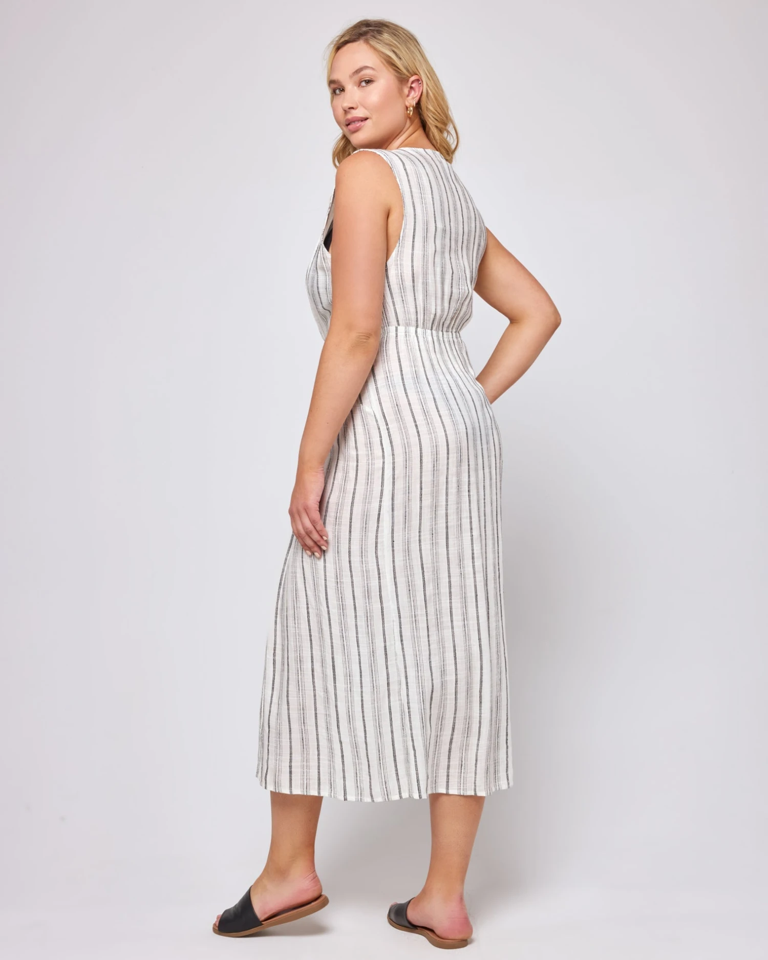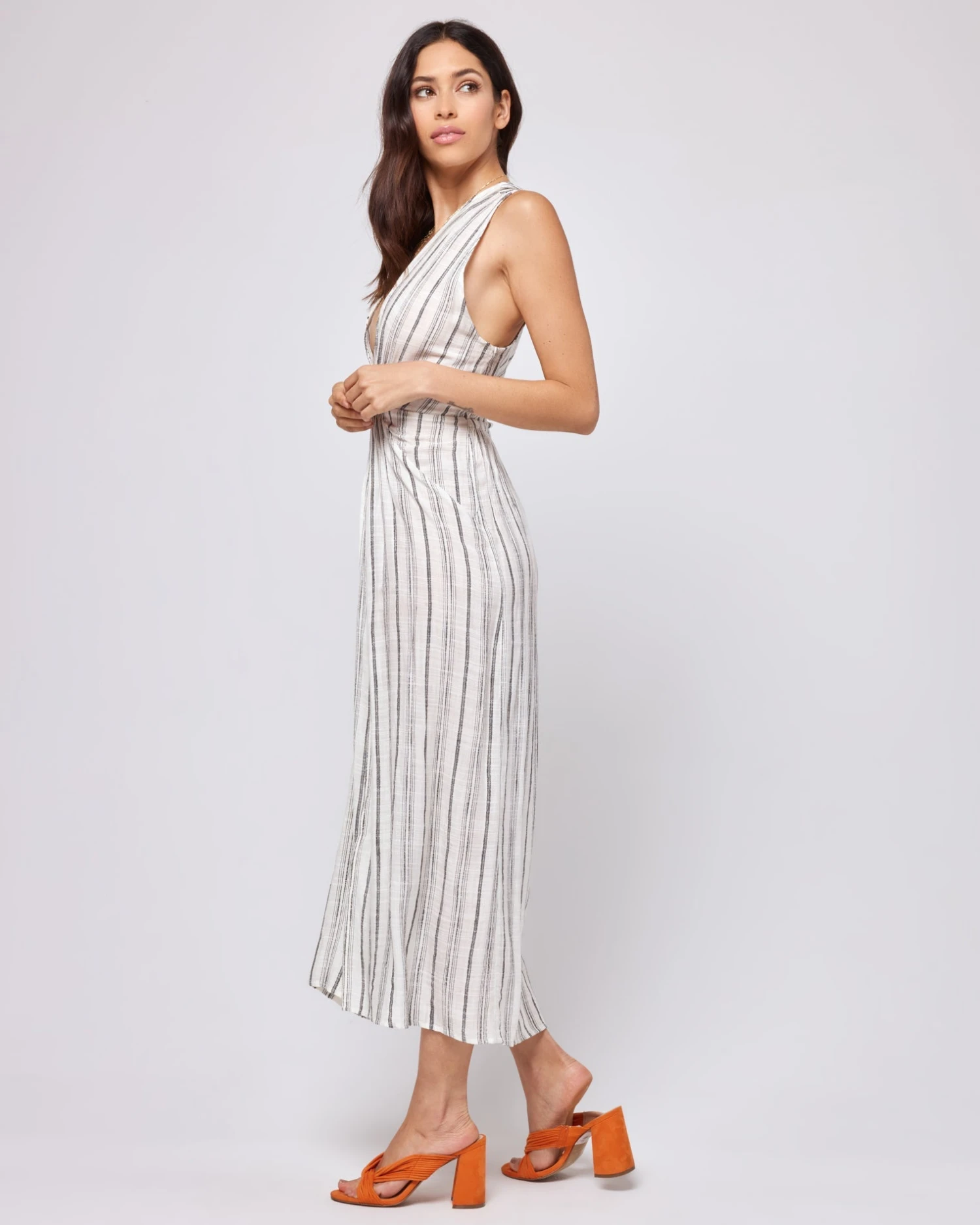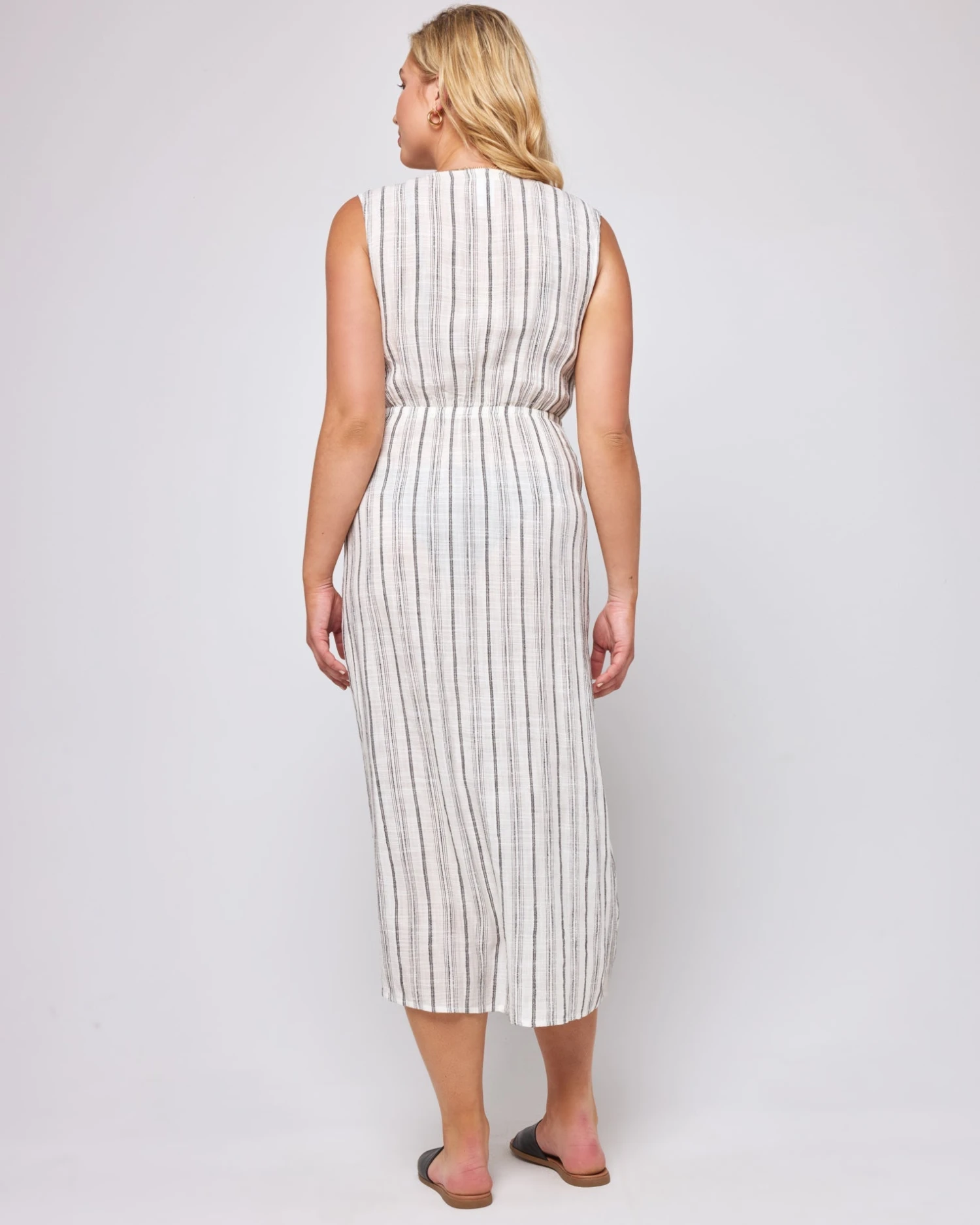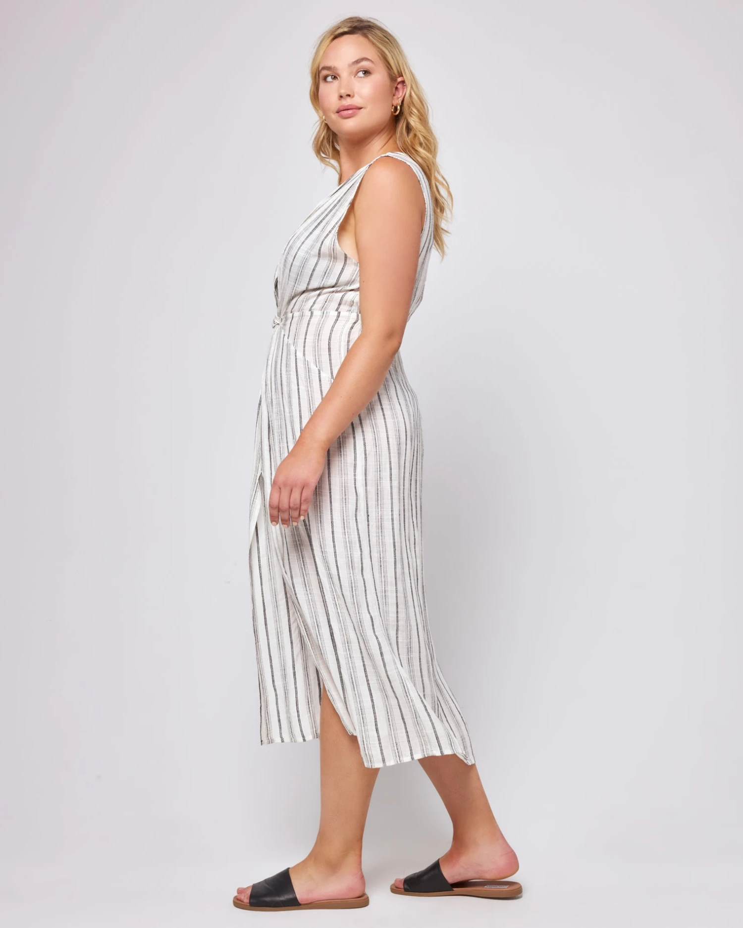 Get low in the Down the Line Cover-Up. A plunging neckline connects to a knotted front, so you can wear her over swimwear or as a stand-alone dress. The high center front slip and elastic waist gives some shape so you can sashay down the beach or boardwalk.