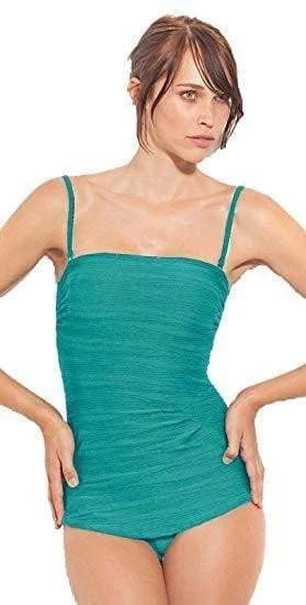 This Gottex Mikado is a textured draped bandeau one piece swimsuit with removable, adjustable over the shoulder straps. It offers soft cups and tummy control that makes you look instantly slimmer.