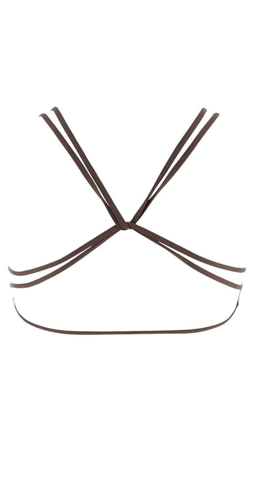 The L Space Sensual Solids Hartley Top in Chocolate is a trendy bralette style top with a sexy ruched front and dual racer back straps. Pair with your favorite bottom.