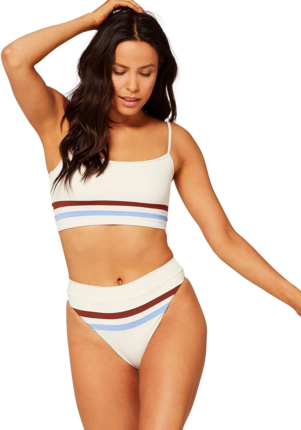 The L* Space Wilson Bottom in bitsy is a high rise high thigh bottom with brown and blue accent stripes.
