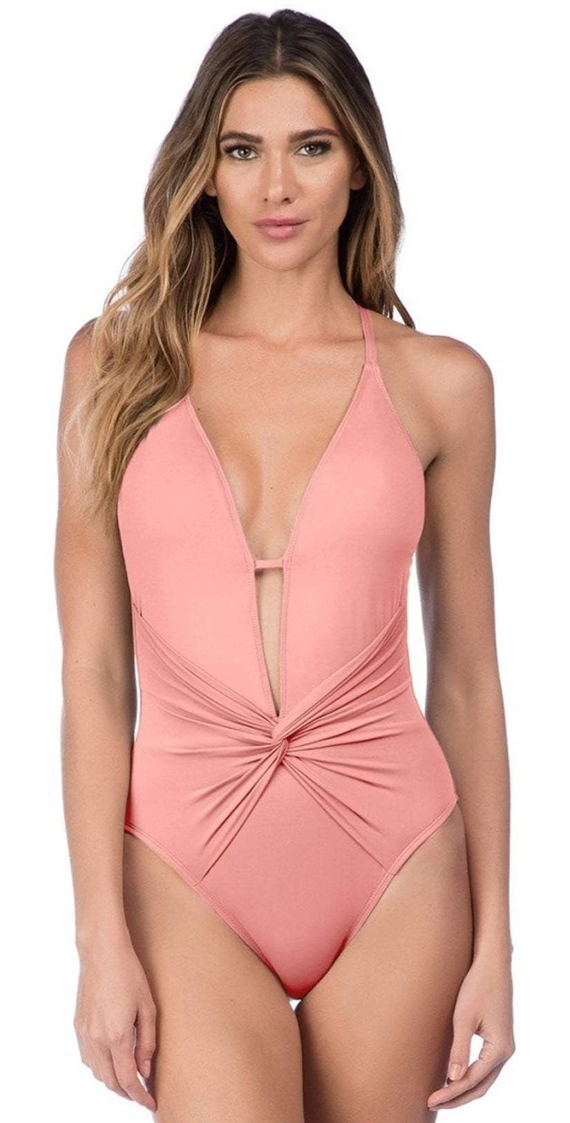 The La Blanca Island Goddess One-Piece Swimsuit in Light Coral is a sexy one-piece with a plunging neckline and front twist. This swimsuit is flattering with tummy control and soft removable cups. The back of this suit has a scoop back with straps that can be worn criss-crossed or as a tank style. The bottom of this suit offers full coverage.