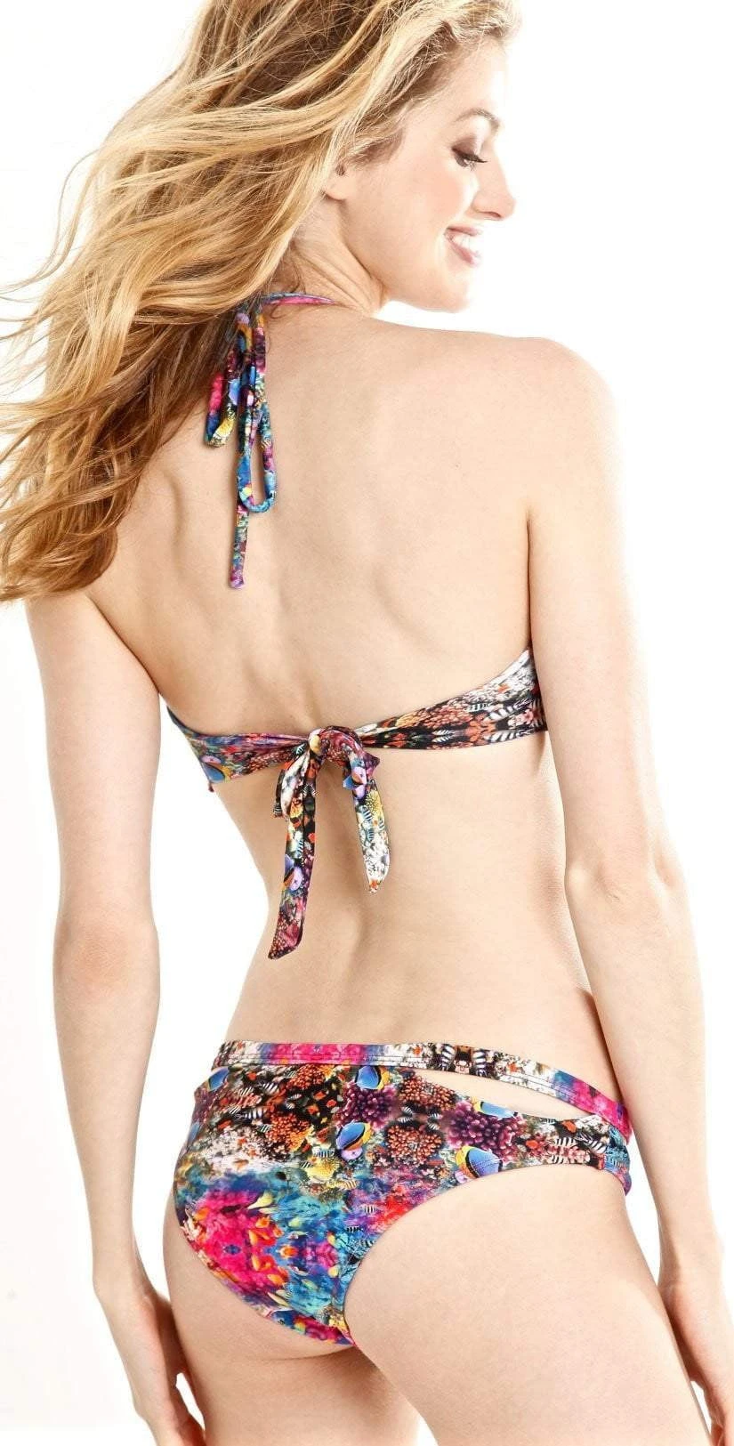 The Peixoto Coral Reef Tamarin Bikini Top features a vibrant multi colored print that is sure to turn heads! The halter top features keyhole cutouts for a subtle yet sexy hint of skin.