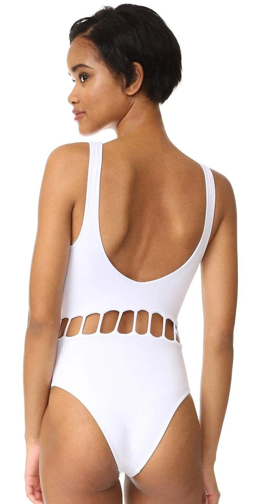 This ultra sexy White one piece by Peixoto features a plunging v-neck with over the shoulder straps, removable cups and a cut out detail around the waist. The back scoops and the bottom offers cheeky coverage.