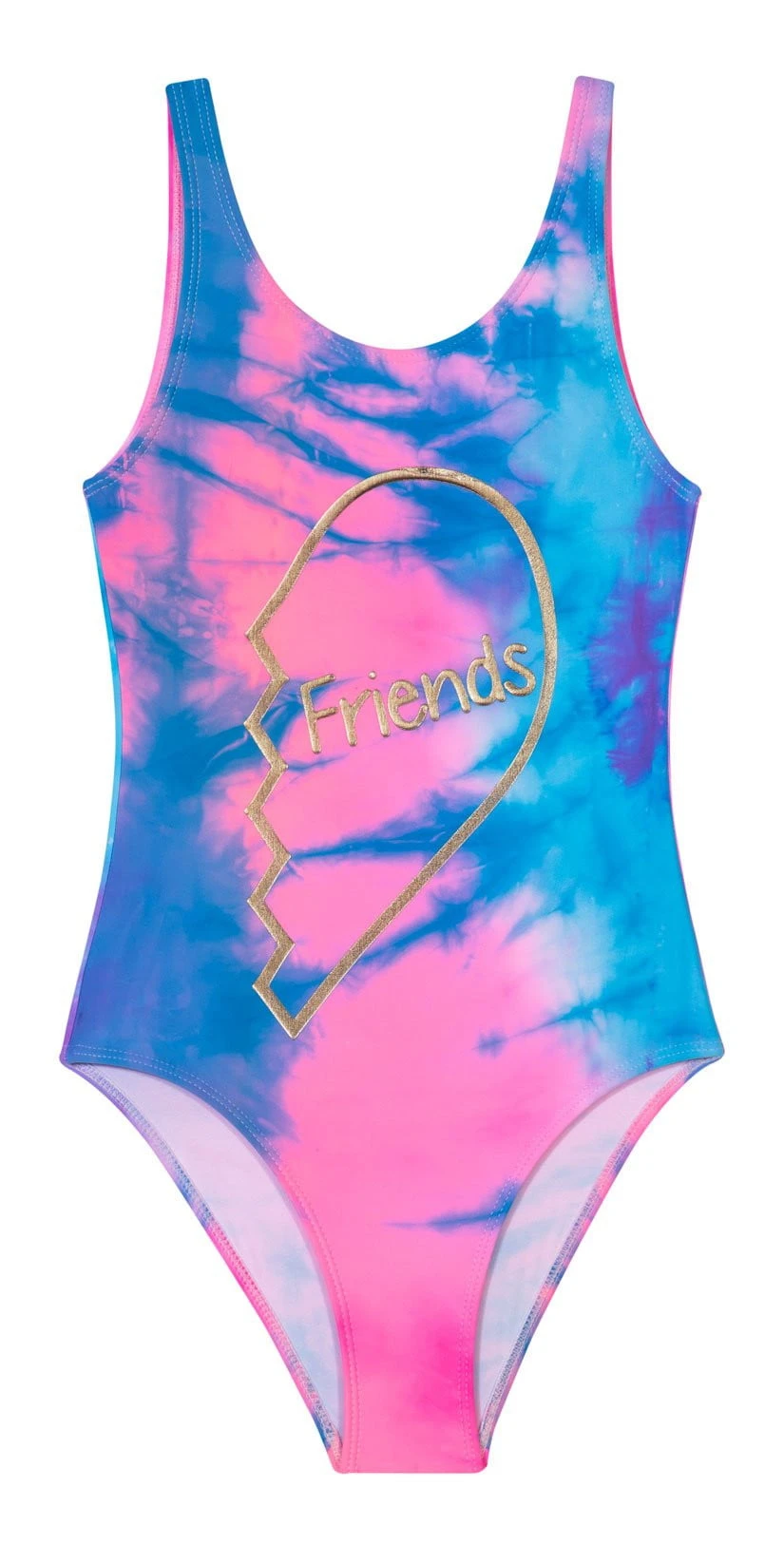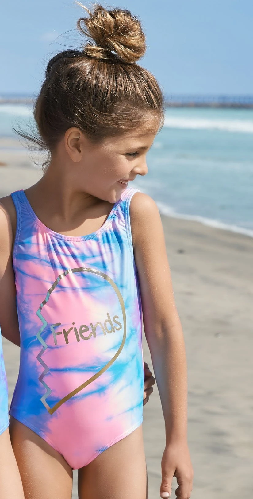 The PilyQ Girls Golden Best Friends One Piece Friends Side is the friends side to the best friends matching swimsuits. This pink and blue tie dyed one piece is the perfect match to your best friend!