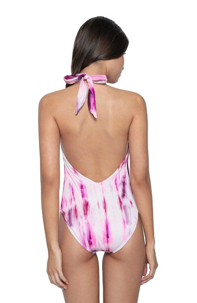 The Avery one piece is a sexy pink suit that features a scoop back and halter straps that tie at the neck, this suit also comes with removable padding.