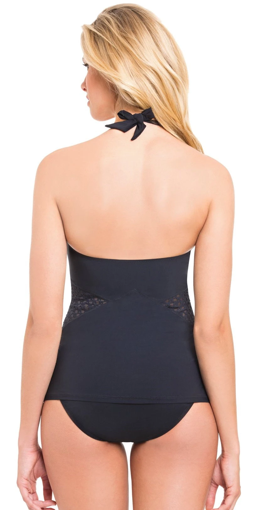 The Profile by Gottex Monte Carlo Zip Up Tankini Top is a sexy top with a zip front and side mesh over lay. This top offers a halter style and ties at the neck, soft cups, shelf bra and zip up front. Pair with your favorite Black Bottom.