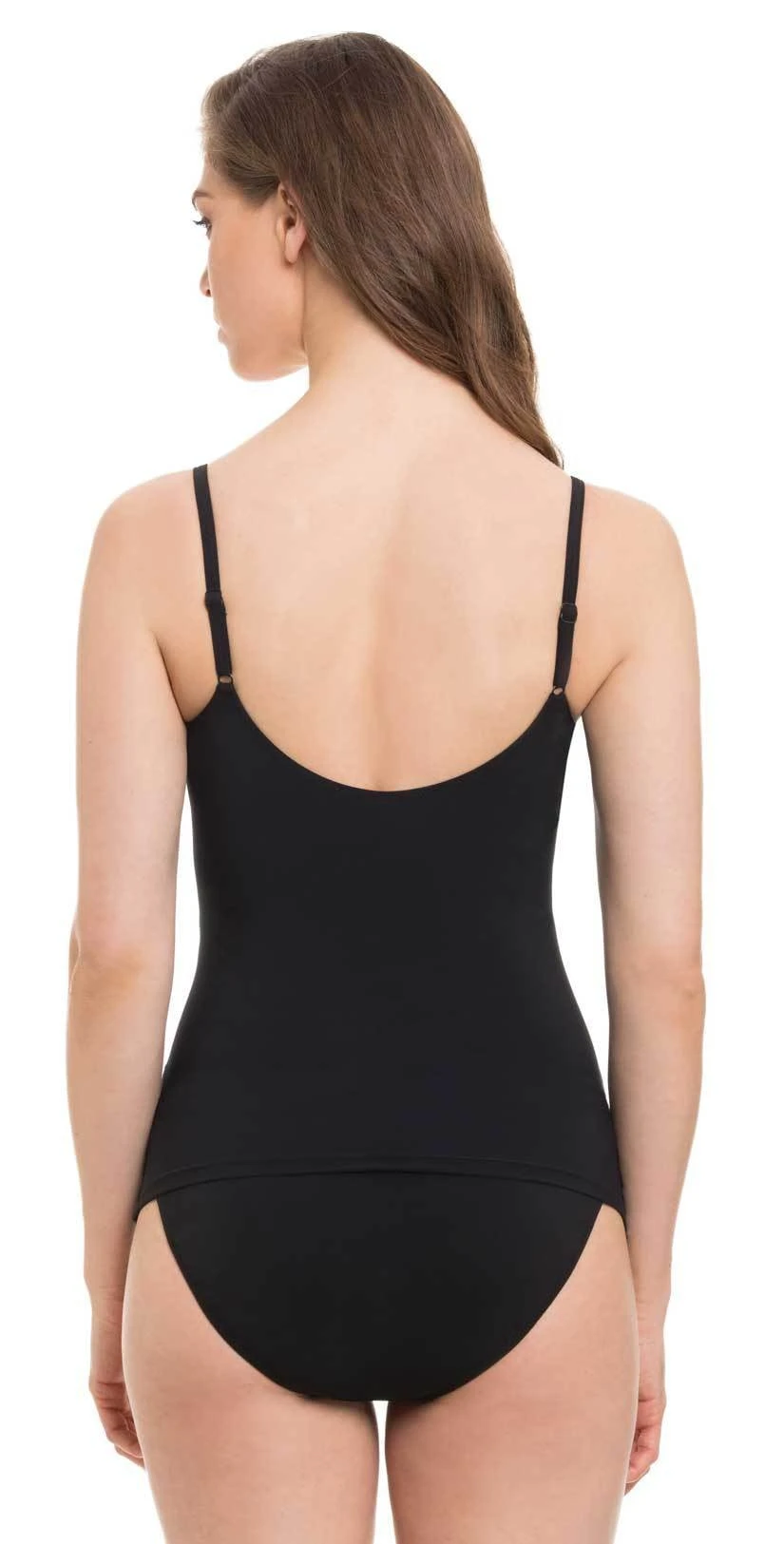The Profile by Gottex Tutti Frutti Tankini in Black is a v neck ruched tankini top. This all black tankini top is flattering, comfortable and classy. Pair with the higher waist bottoms HERE