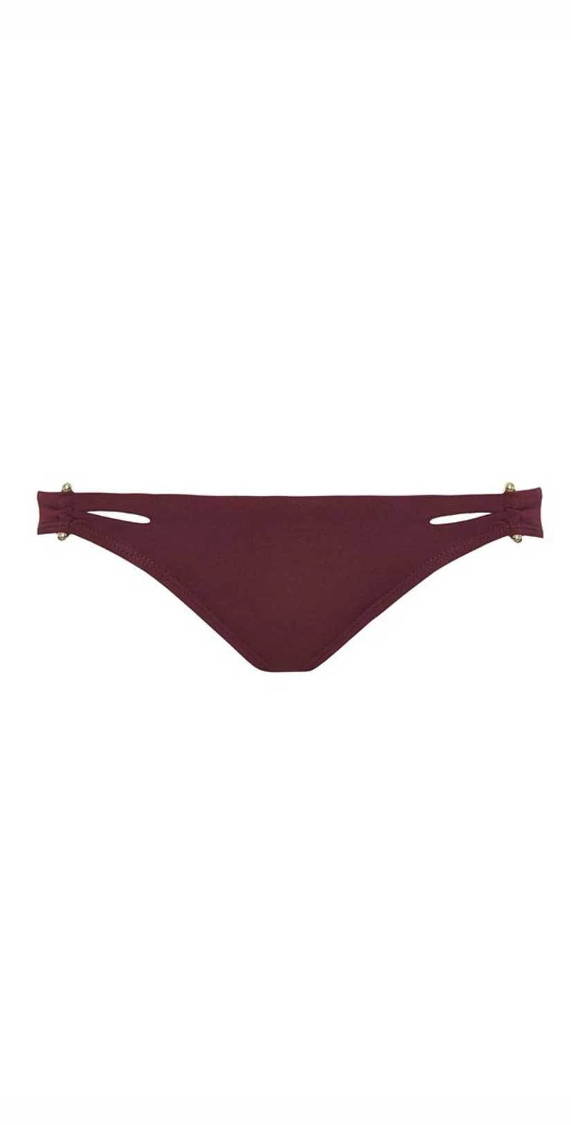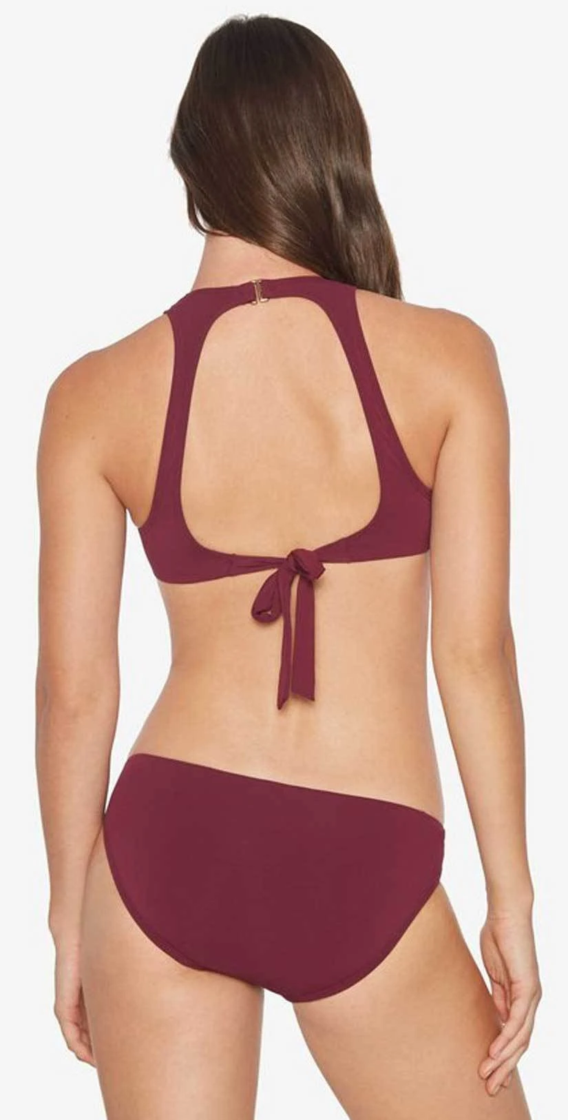 The Robin Piccone Luca Cut Out Bikini Bottom in Rubine is sexy and functional. Featuring gold metal accents with moderate back coverage and cut out details at the hips. Pair with the matching Luca Keyhole Bikini Top in Rubine.