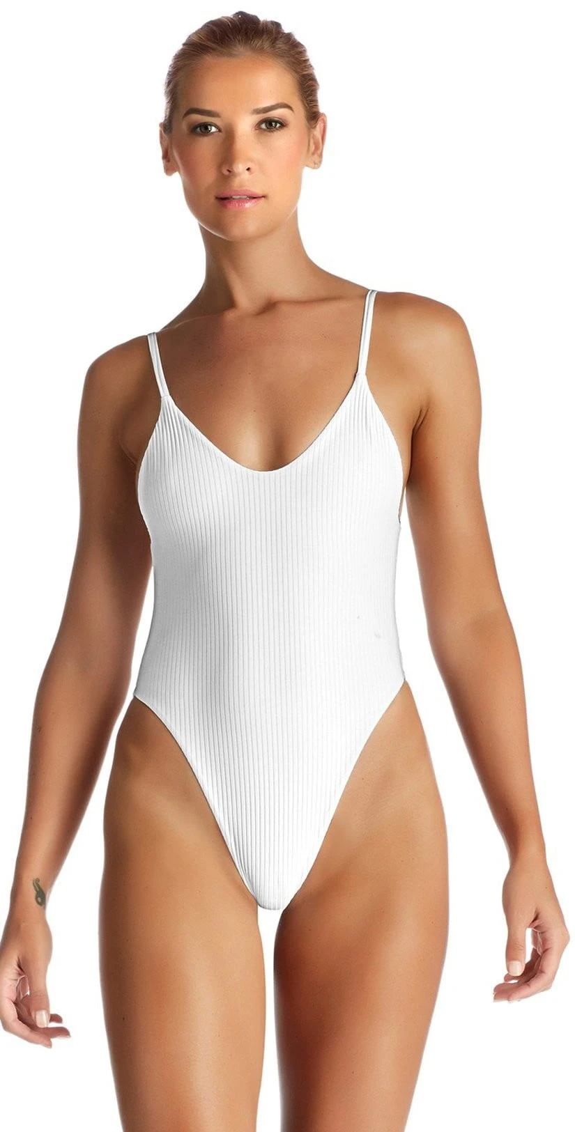 The Vitamin A EcoRib Yasmeen One Piece in White is a sexy and sporty ribbed one-piece swimsuit. This suit features an open scoop back, thin adjustable tank straps and a Brazilian style bottom. This fully lined suit is made of 84% Recycled Nylon and 16% Lyrica.